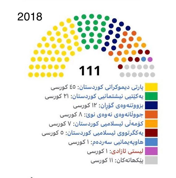 ساڵی ٢٠١٨ کۆمیسیۆنی ھەڵبژاردن و ڕاپرسیی کوردستان، هەڵبژاردنی پەرلەمانی کوردستانی بەڕێوەبرد و ئەو ئەنجامەی لێکەوتەوە کە لە گرافیکەکە دیارە، پارتی دیموکراتی کوردستان ٤٥ کورسی، یەکێتیی نیشتمانیی کوردستان ٢١ کورسی، بزووتنەوەی گۆڕان ١٢ کورسی، نەوەی نوێ ٨ کورسی، کۆمەڵی ئیسلامی ٧ کورسی و یەکگرتووی ئیسلامی ٥ کورسی بەدەست ھێنا.